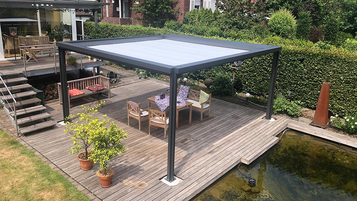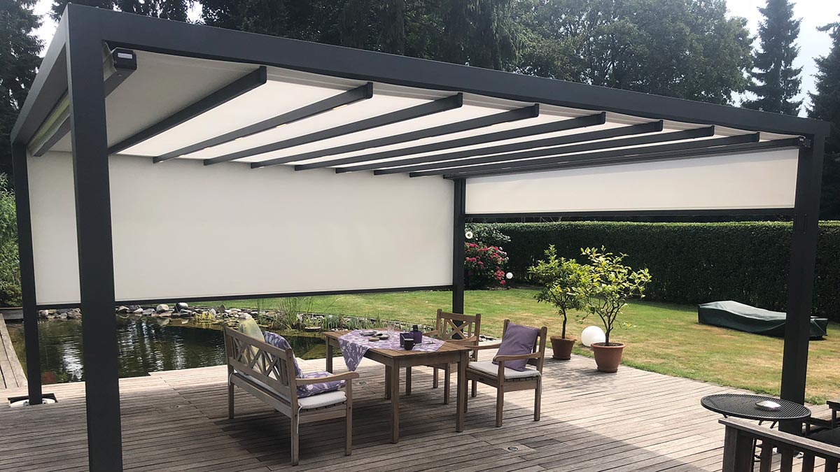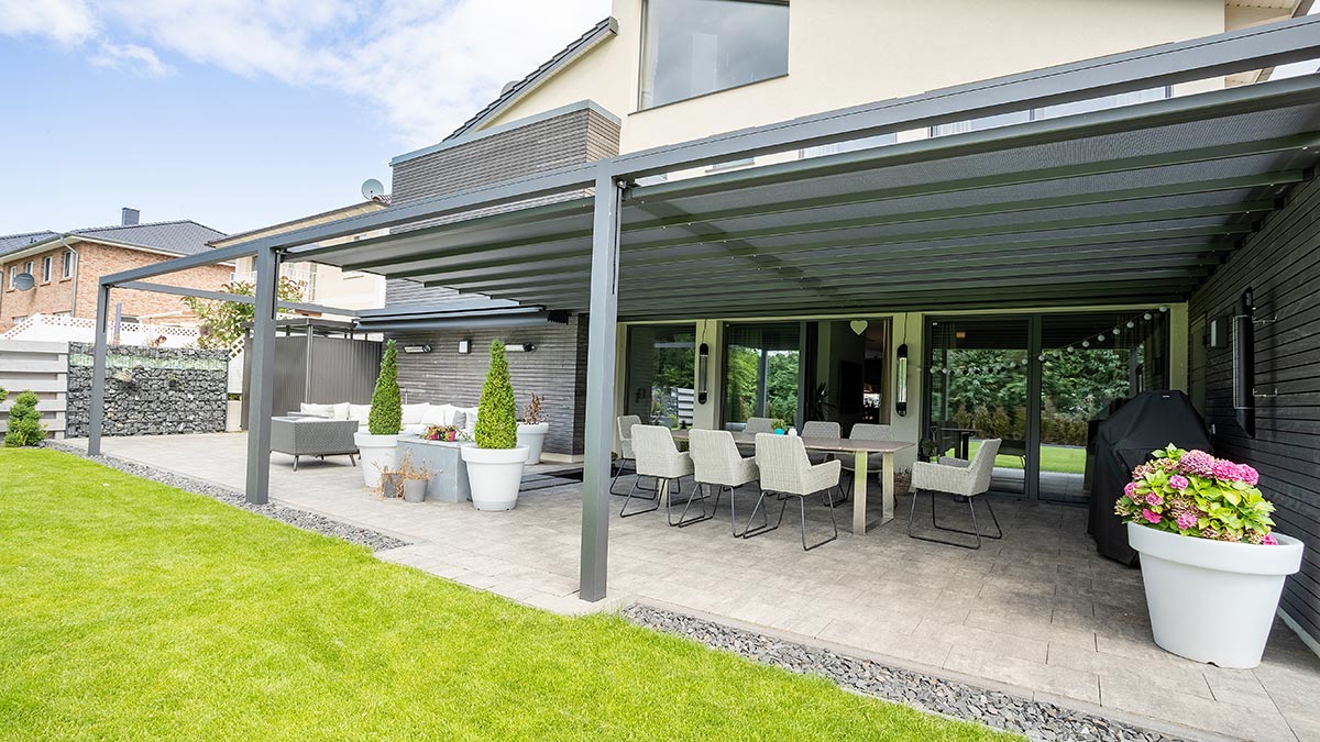 Pergola-Markisen von LEINER vereinen textile Leichtigkeit mit besonders hoher Stabilität – ideal für große Flächen, windige Standorte oder exponierte Lagen. Durch die fest verankerten Führungsschienen und Stützpfosten halten sie auch stärkeren Windbelastungen stand und bieten dabei eleganten, wetterfesten Sonnenschutz. Mit klaren Linien, modernem Design und vielen Ausstattungsoptionen lassen sich LEINER-Pergola-Markisen perfekt an Ihre Wünsche und die Architektur Ihres Hauses anpassen.